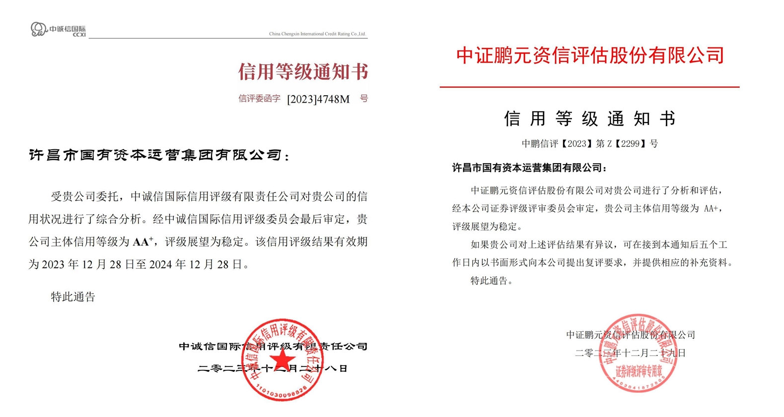 2023年12月28日、12月29日,經(jīng)國(guó)內(nèi)權(quán)威評(píng)級(jí)機(jī)構(gòu)中誠(chéng)信國(guó)際信用評(píng)級(jí)有限責(zé)任公司、中證鵬元資信評(píng)估股份有限公司專(zhuān)業(yè)評(píng)定,許昌市國(guó)有資本運(yùn)營(yíng)集團(tuán)有限公司先后獲得AA+主體信用評(píng)級(jí),評(píng)級(jí)展望為穩(wěn)定。