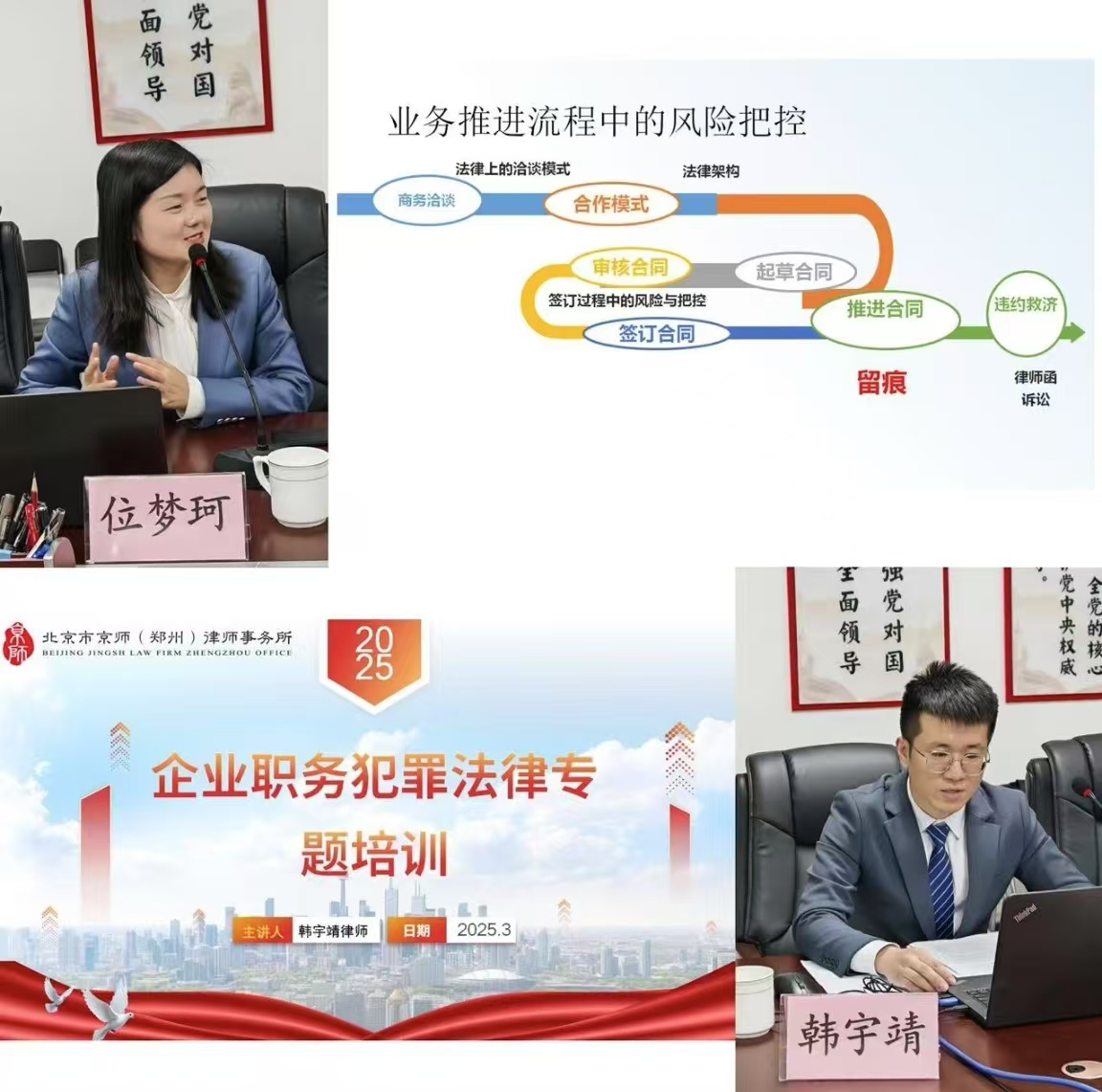 會上,位夢珂律師以公司治理為視角,立足企業(yè)合規(guī)經(jīng)營實(shí)務(wù),系統(tǒng)梳理了合同全生命周期管理要點(diǎn)。通過典型案例剖析,重點(diǎn)闡釋了合同起草審查、簽訂履約監(jiān)控及終止解除階段的風(fēng)險(xiǎn)防控策略,并針對性地提出企業(yè)合同管理制度構(gòu)建的標(biāo)準(zhǔn)化流程與操作指引。韓宇靖律師聚焦企業(yè)廉潔風(fēng)險(xiǎn)治理,運(yùn)用"案例教學(xué)+實(shí)務(wù)研討"模式,深度解讀職務(wù)犯罪的類型特征、發(fā)案規(guī)律及防控路徑,警示性地揭示了企業(yè)內(nèi)部監(jiān)督機(jī)制存在的薄弱環(huán)節(jié)。